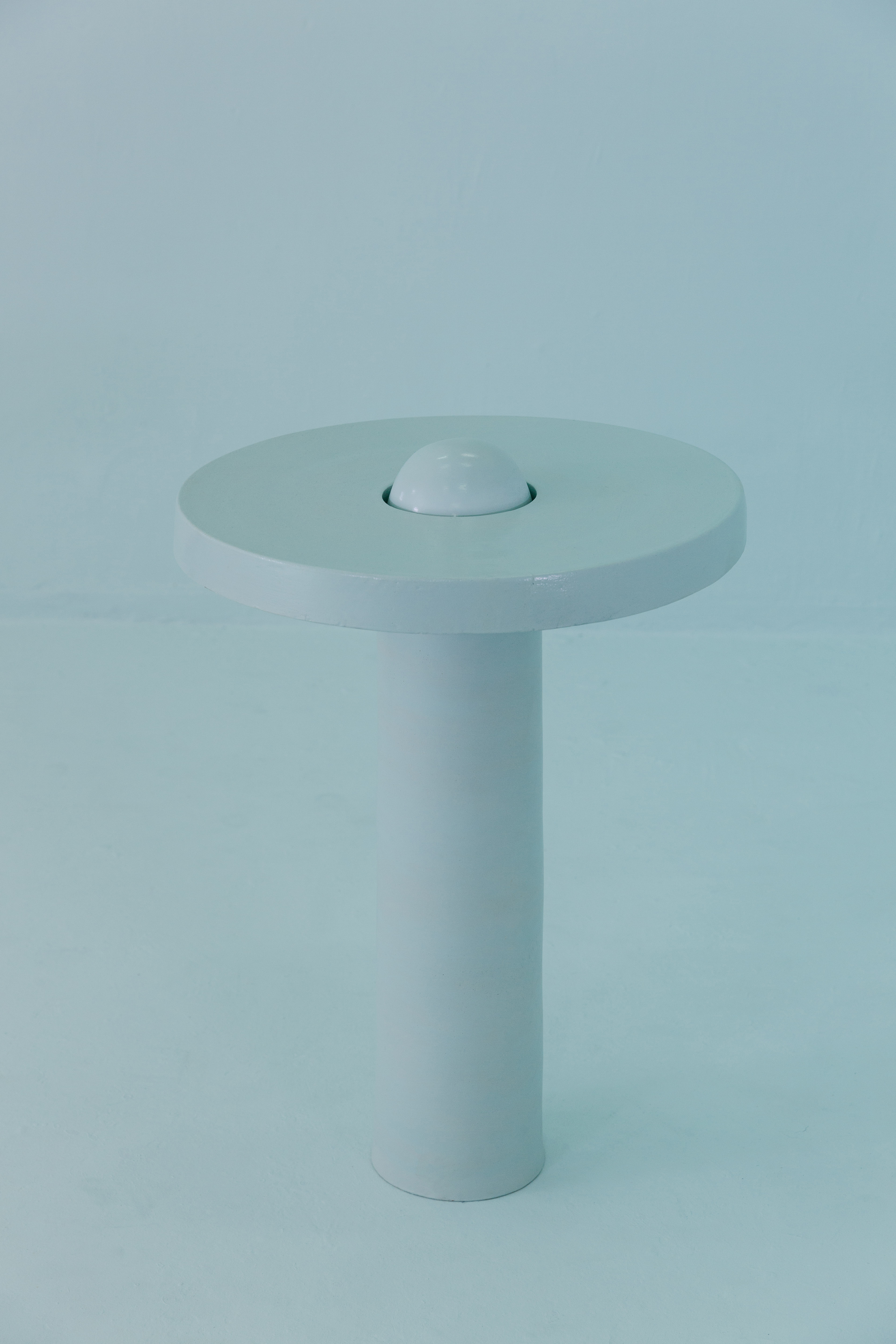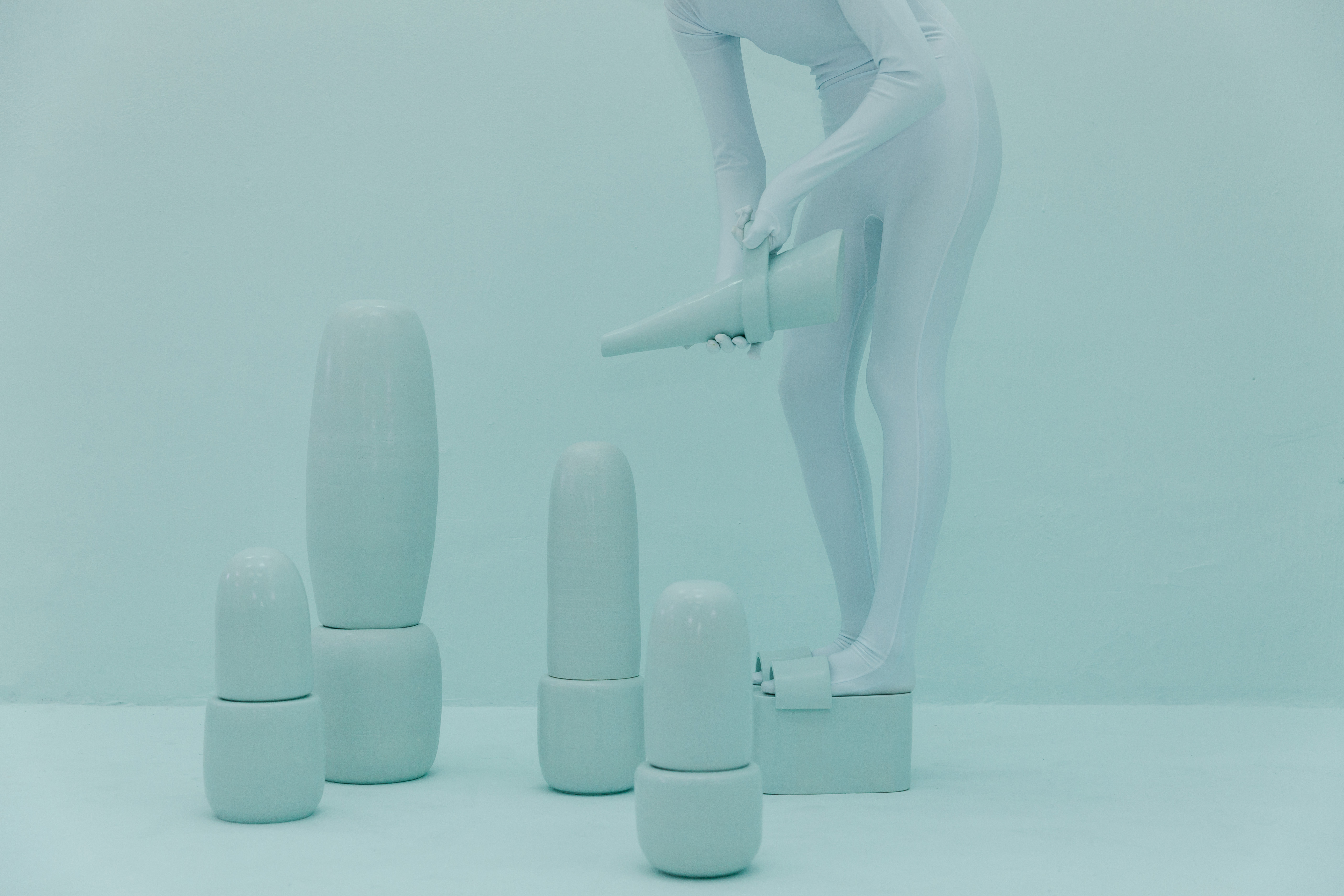 The woman uses symbolic ceramic objects such as platform shoes, a hand fan, watering can and a mop.